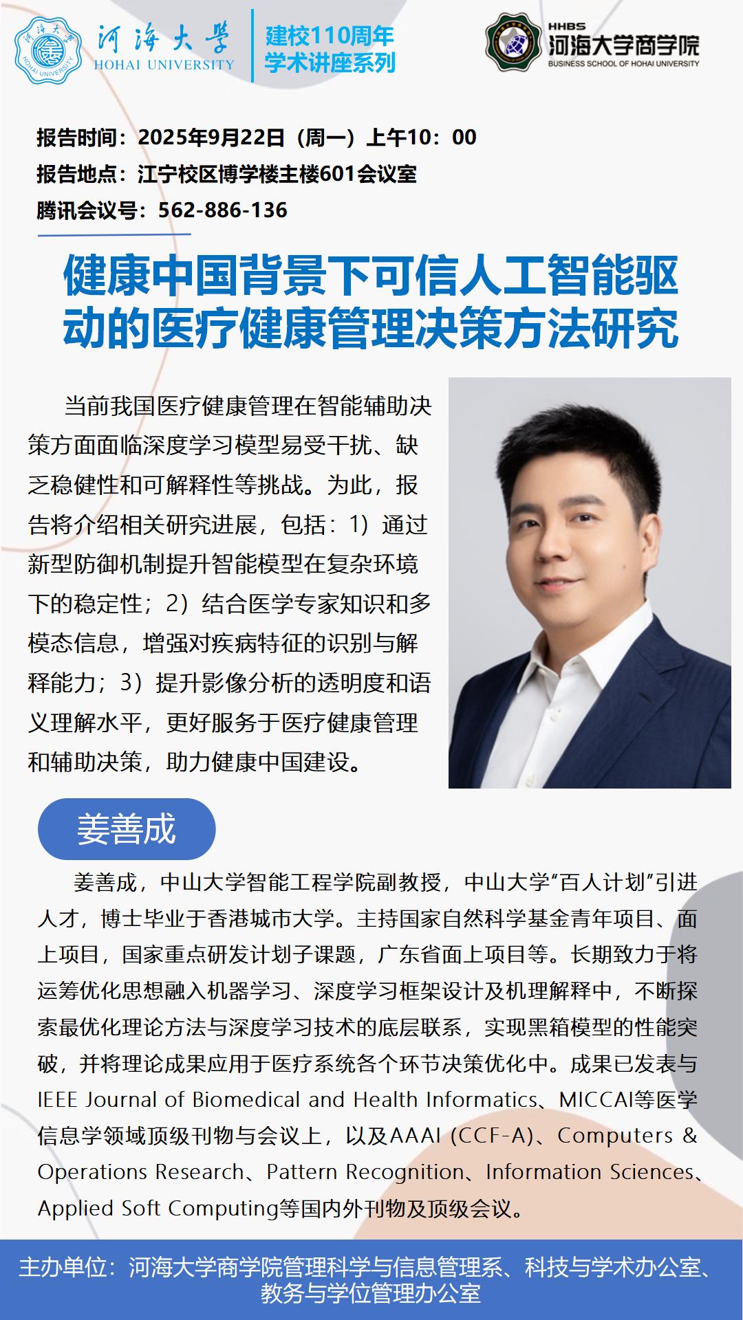 学术讲座通知:健康中国背景下可信人工智能驱动的医疗健康管理决策方法研究