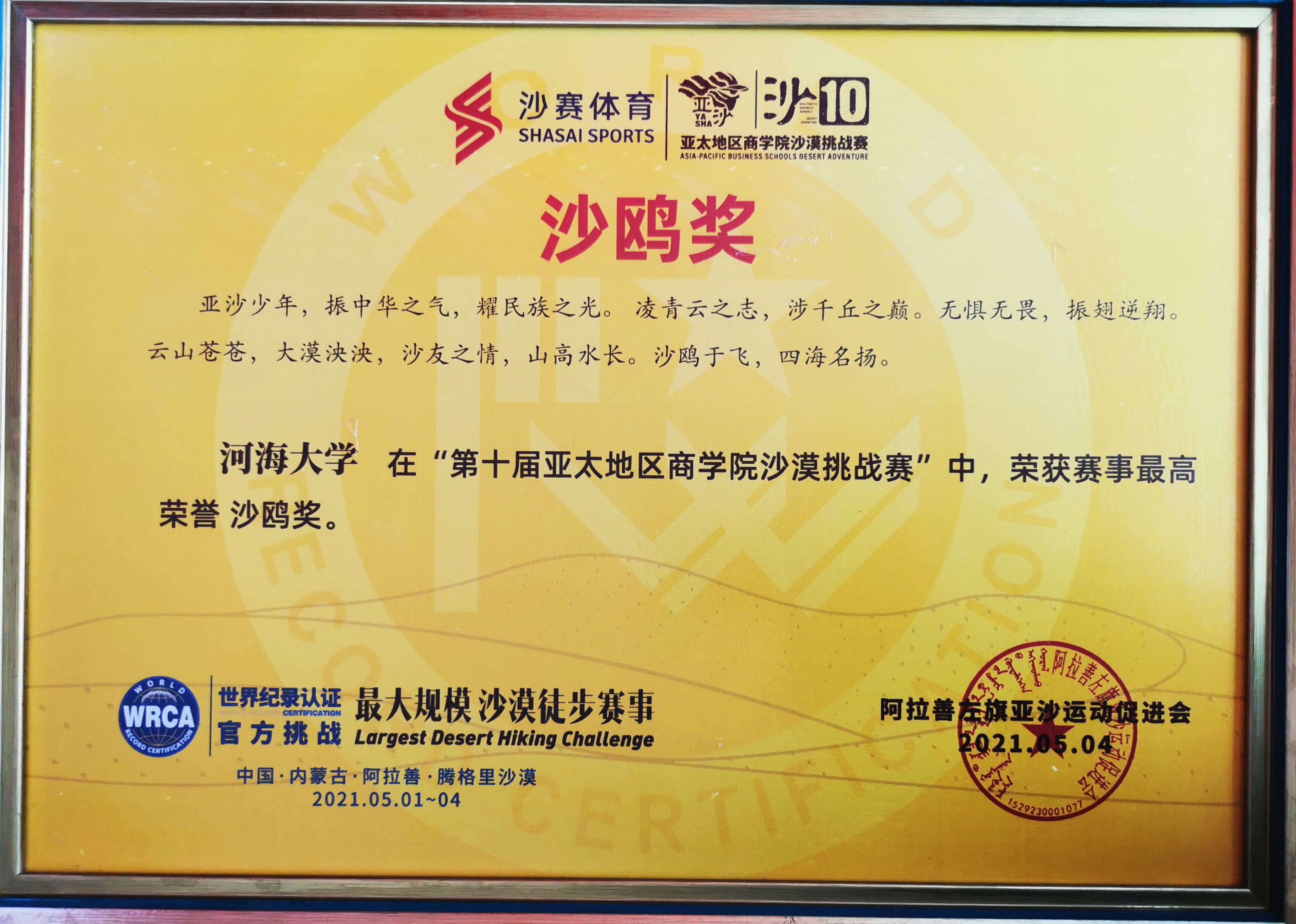 2021年5月2日至4日,第十届亚太地区大赢家比分 沙漠挑战赛在内蒙古阿拉善盟左旗腾格里沙漠举行。来自亚太地区121所院校,4000余人共同参赛,在亚沙十年之际创下历届亚沙赛规模之最。由大赢家比分 大赢家比分 组建的“沙10战队”获MBA组团体第五名,并摘得大赛最高荣誉“金沙鸥奖”。同时,个人组获女子超A队第六名、男子A队第九名、女子C队第九名好成绩。