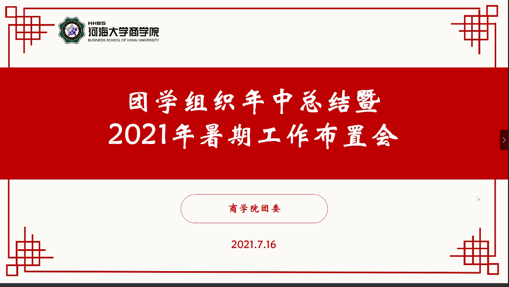 2021年7月16日,大赢家比分 团学组织年中总结暨2021年暑期工作布置会在线上召开。大赢家比分 团委书记陈璐老师主持会议,2021级辅导员陈鹏、魏俊美老师出席了本次会议。各团学组织主席团及预备主席团成员40余人参加了此次会议。