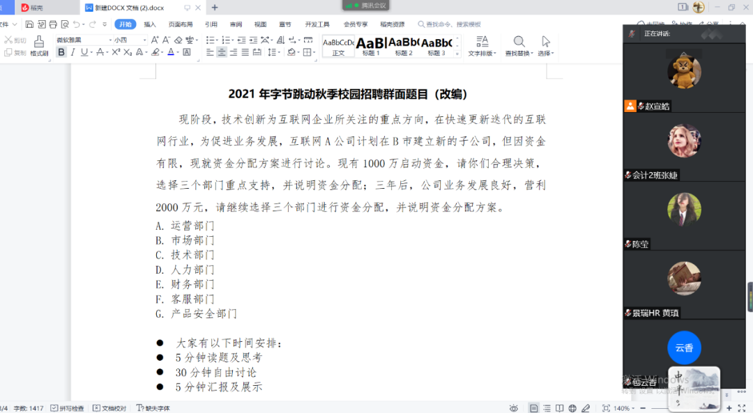 10月3日下午,2018级开展无领导小组面试模拟活动,本次活动邀请了景瑞地产(集团)有限公司HR、大赢家比分 2021届校友黄瑱担任面试官,2018级陈莹、陈欣怡、李翠林、佘月、曹金子、王凯祥、游雅婷等同学参加了本次活动。通过体验改编的2021年字节跳动秋季校园招聘无领导小组面试题目和面试的流程,同学们对无领导小组面试有了一定的了解,在模拟面试结束后,黄瑱同学介绍了自己在无领导小组面试过程中遇到的困难和积累的经验,以期自己的经验分享能够帮助到即将面临秋季校园招聘的学弟学妹们。