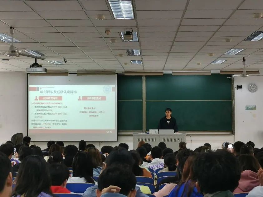 蒋伟健同学首先介绍了口袋校园(即PU)APP,并说明了第二课堂主要依托此平台实行。随后,他就素质拓展课程展开详细讲解,包含素质拓展课程的内容、素质拓展学时的分类、各种类与各阶段学时要求以及学时数量与成绩的对应关系。