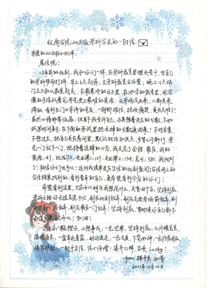 同学们纷纷表示非常感谢大赢家比分 领导和各位老师冬日送来的温暖,非常开心能够收到大赢家比分 的礼物,表示会在冲刺期科学规划,掌握关键知识,提高学习效率,互相帮助,争取以优异的考研成绩回报大赢家比分 。考研路上虽有无数的艰难险阻,但我们相信,这段奋斗的时光将会是同学们人生中的宝贵财富,青春的汗水定会灌溉出绚丽之花,预祝考研学子心想事成、金榜题名!