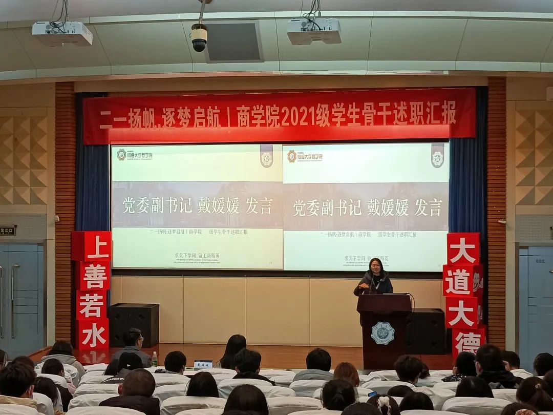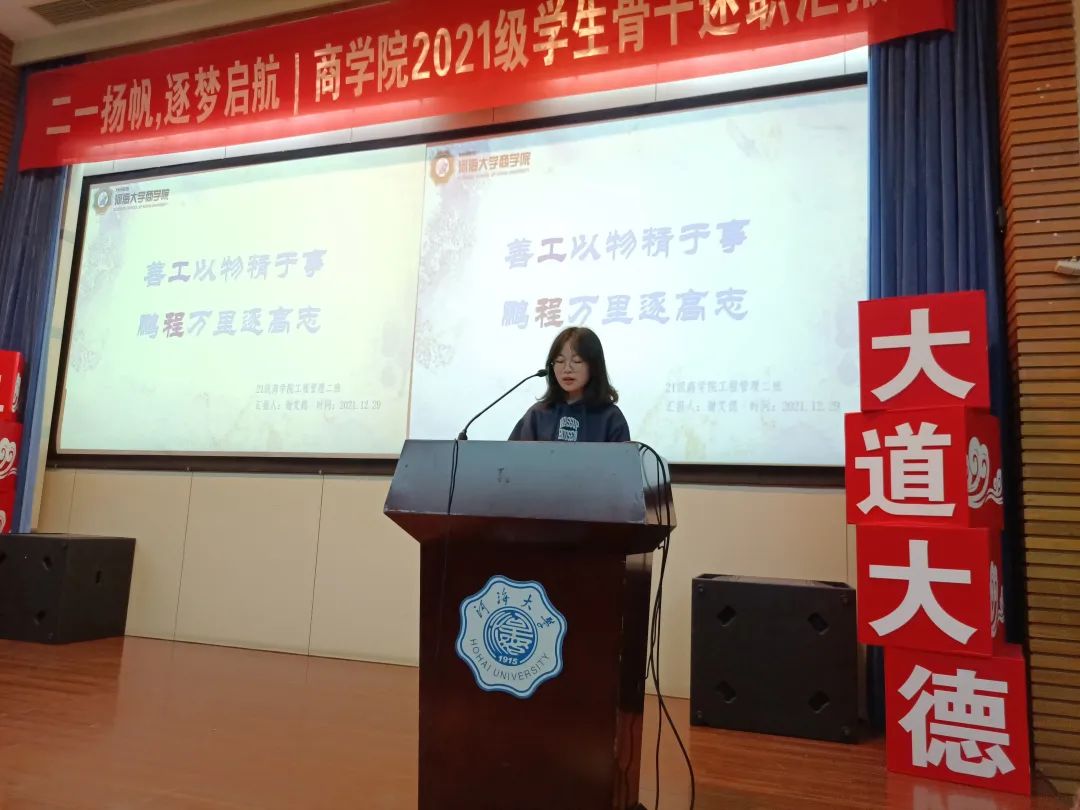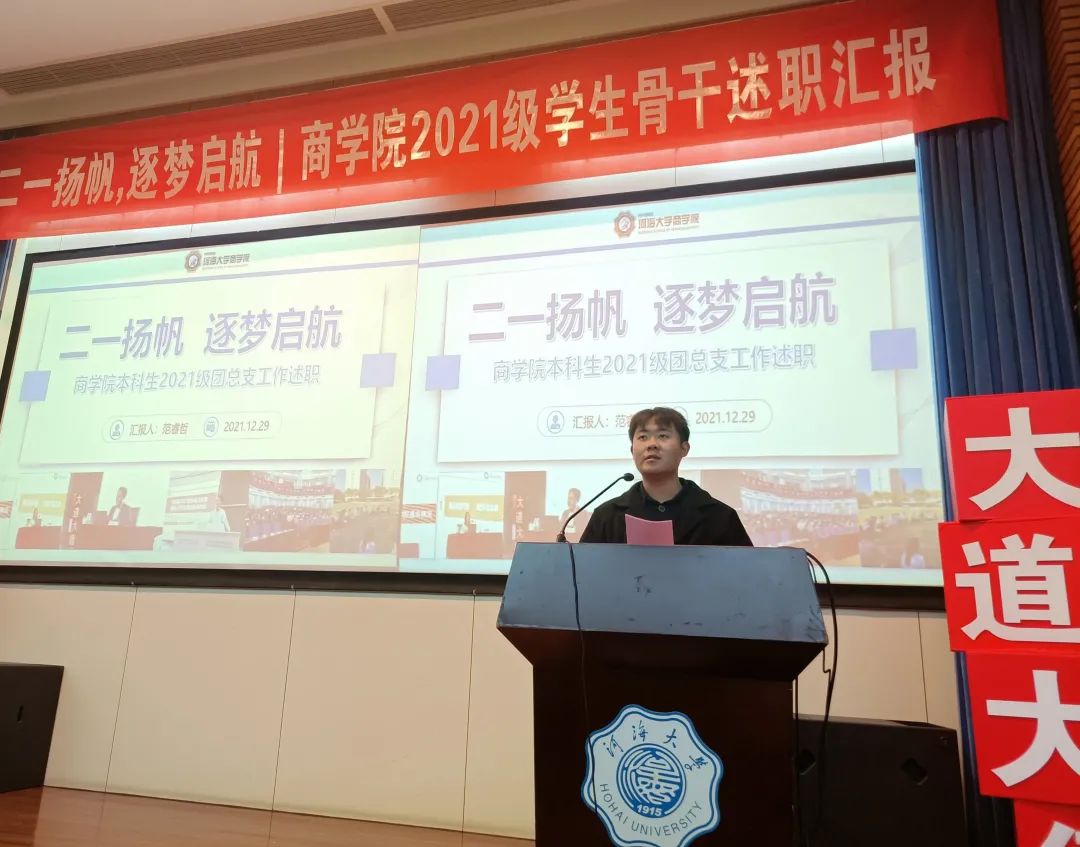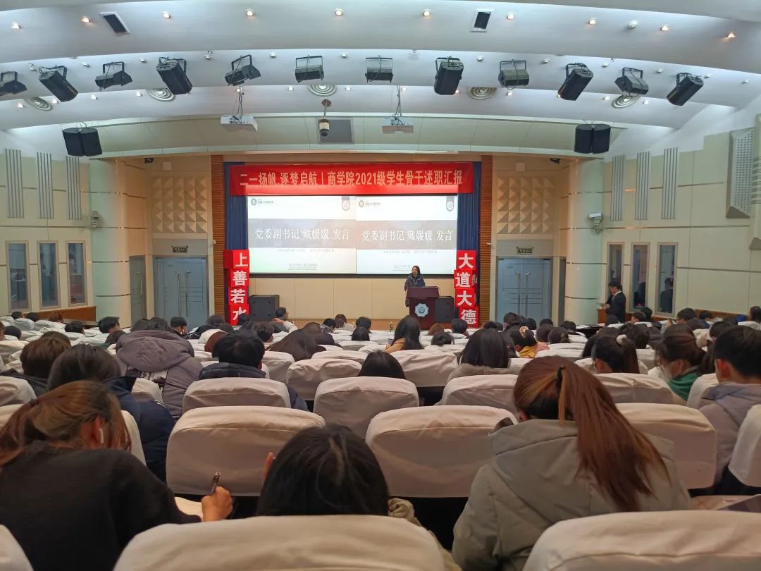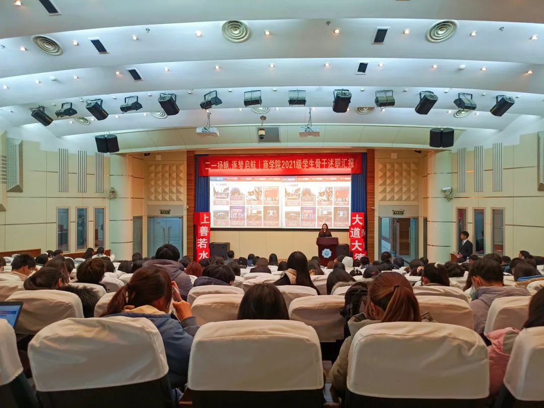 为助力2021级新生学生骨干综合素质涵育、强化学生骨干队伍建设,增强学生骨干自我教育、自我管理、自我服务、自我监督的意识,搭建学生骨干交流学习平台,12月29日晚,2021级团总支于江宁会议中心组织开展学生骨干述职汇报大会。