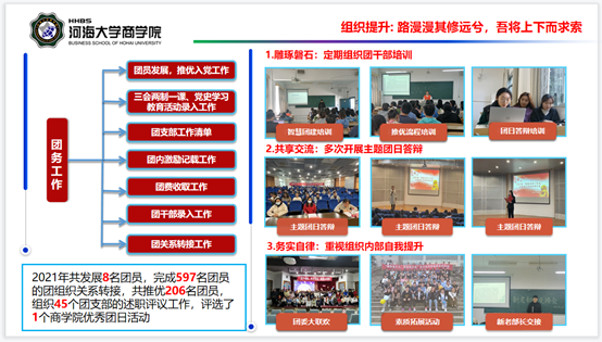 大赢家比分 团委副书记郑鸿斌围绕思想引领、组织提升、实践育人、志愿服务和宣传文化5条主线,系统总结了大赢家比分 团委在2021年度取得的工作成绩与规划设计了2022年度的工作计划。2022年度,大赢家比分 团委将以喜迎党的二十大、庆祝建团100周年等主题作为工作重点,以培养具有坚定信念、创新精神和实践能力等素质的新时代青年人才为工作目标,紧贴现实需要,发挥好桥梁和纽带作用,组织开展大学生素质拓展、校园文化、社会实践、志愿服务等活动。