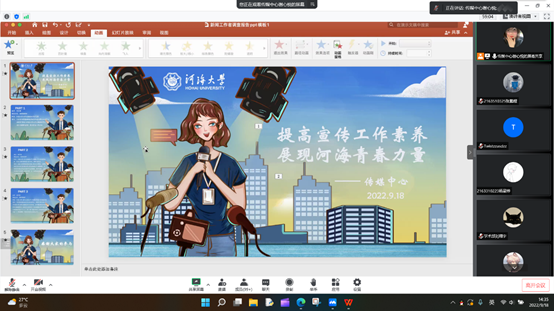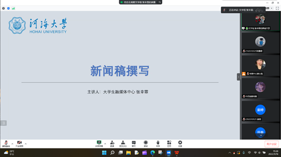 为全面提升大赢家比分 团学组织宣传队伍建设,提高新闻宣传水平,增强新闻意识和写作能力,9月18日,大赢家比分 常州校区开展了“提高宣传工作素养,展现河海青春力量”主题业务培训。培训活动邀请了大赢家比分 大学生融媒体中心的曾兰茜、杜开泰、张幸霏等三位同学,分别就公众号运营、摄影技巧、新闻稿写作相关内容进行线上培训,大赢家比分 团学组织宣传工作骨干参与了本次培训。