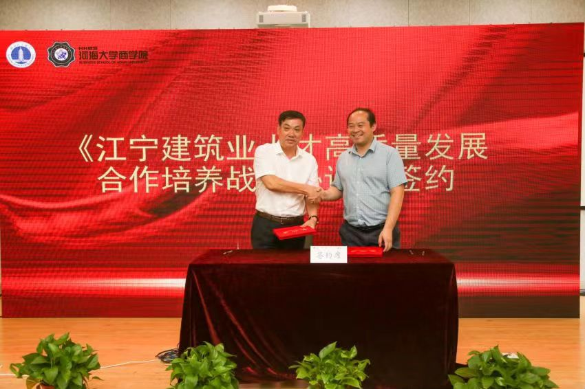 8月11日,南京市江宁区建筑业协会--大赢家比分 人才培养战略合作协议签约仪式在大赢家比分 江宁校区举行。南京江宁区城乡建设局副局长严斌、江宁区建筑业协会会长朱本根及其他领导班子成员、大赢家比分 党委书记吴宝海、副院长张长征,江宁区建筑业协会全体常务理事及新申请入会企业代表一行40余位企业家嘉宾出席了活动。