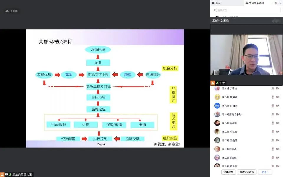 首先,王龙老师向营员们生动形象地介绍了商业计划书的特征、导向、起点和核心,让同学们对商业计划书有一个初步的了解。随后,王龙老师重点讲解了怎么寻找现有市场的痛点,并以蒂蒙斯商业模型为基础,指明创新创业的三大要素——商机、资源、团队,三点缺一不可,并从环境分析、竞争战略、顾客需求等方面分别阐明其在创新创业全过程的重要性。