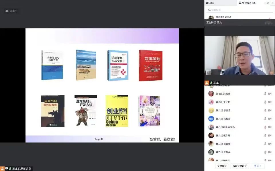 讲座结束前,考虑到有些同学出于兴趣爱好参加一些企业的赛事,王龙老师陈述了现状描述、机会识别和受众及目标等计划书的注意点,并为同学们列举了一些相关书目供同学们补充创新创业的知识。