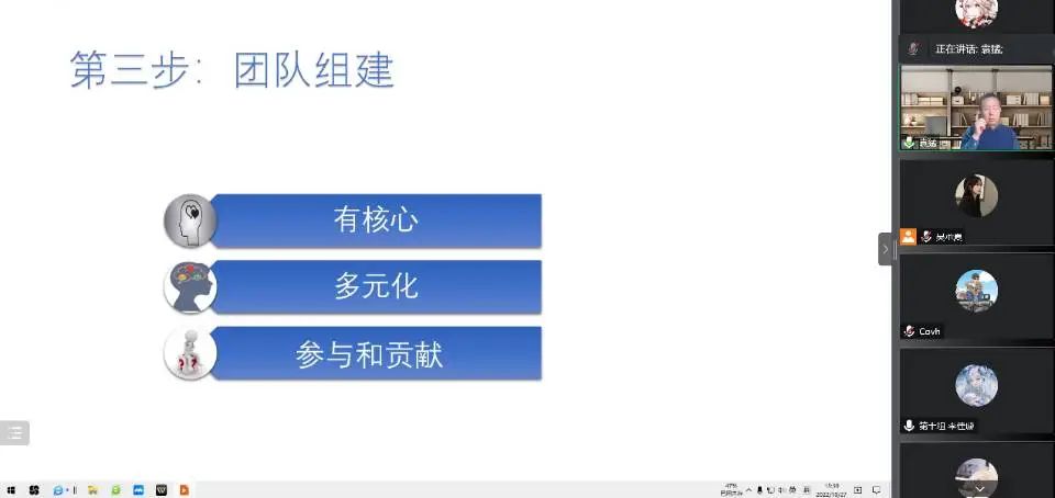 讲述完竞赛准备,袁猛老师重点给营员们介绍了第二步:项目选择。他指出项目的选择要做到“览大势”和“显特色”两个方面。一方面,项目的选择要顺应国家需要与时代发展;另一方面,项目也需具有河海特色。他还为营员们概括了具体的方法:合纵连横,检索科技成果,利用大创项目进行转化。随后袁猛老师介绍了第三步“团队组建”,也强调了应多专业多大赢家比分 共同参与,合理分工,并根据项目内容确立核心。