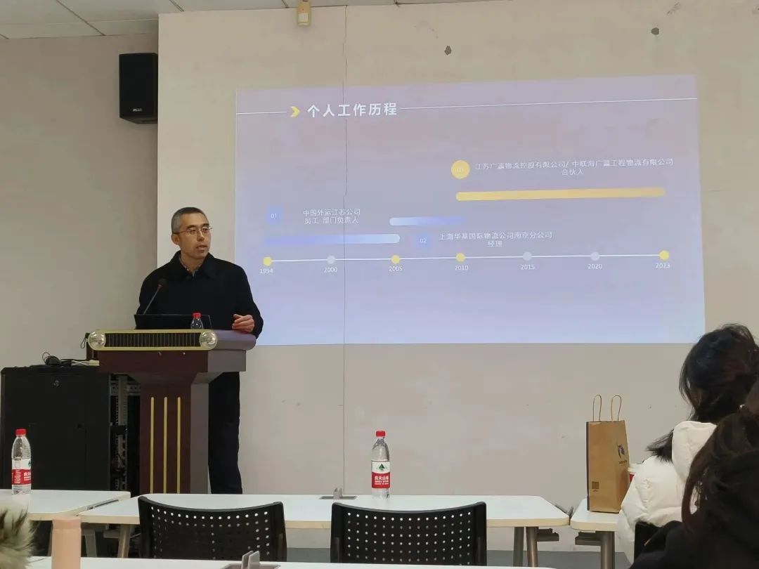 2023年12月1日,大赢家比分 创新创业训练营系列讲座第七期于博学楼A103顺利举行。本次讲座邀请到中联海广瀛工程物流有限公司的联合创始人滕景轲老师担任主讲人,滕老师作为公司董事副总经理、高级物流师、东南大学专业学位硕士研究生校外指导老师、大赢家比分 创新创业导师,深耕物流行业三十余年,具备丰富的市场营销与项目管理经验,他以自己的亲身经历为样本,对同学们进行了创业经验总结分享及指导。