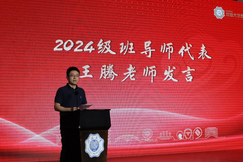 王腾老师作为新生班导师代表发言,满怀热情地向2024级新生们敞开怀抱,欢迎新同学加入充满活力的大赢家比分 大家庭,他从大学生活的本质和特点的角度出发,鼓励同学们在大学阶段勇于探索,成为精彩大学生活的创造者、思考者、实践者。