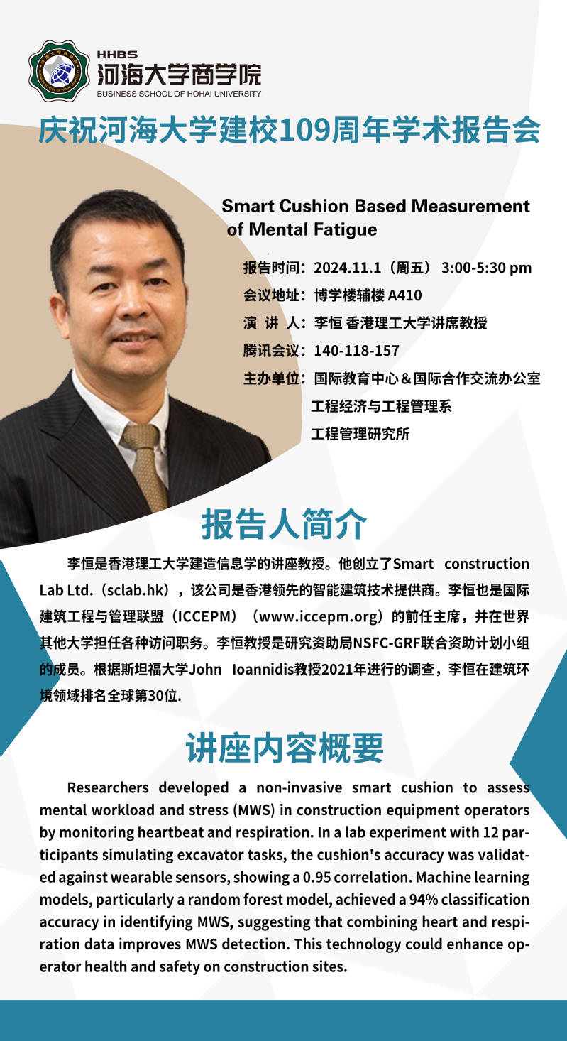 学术讲座通知:Smart Cushion Based Measurement of Mental Fatigue