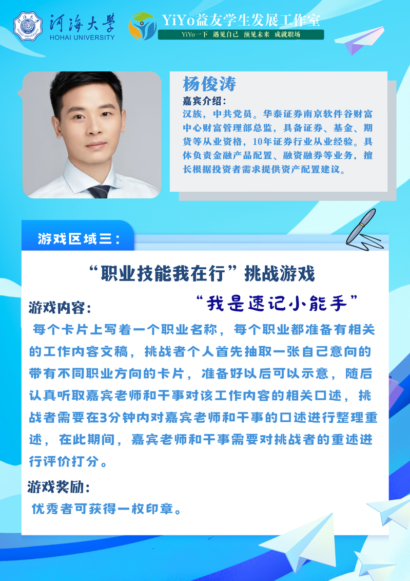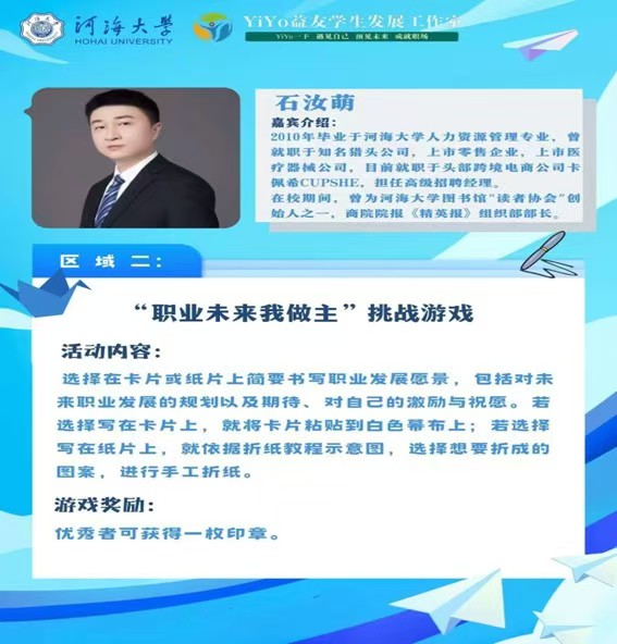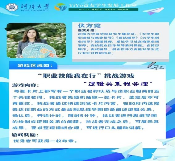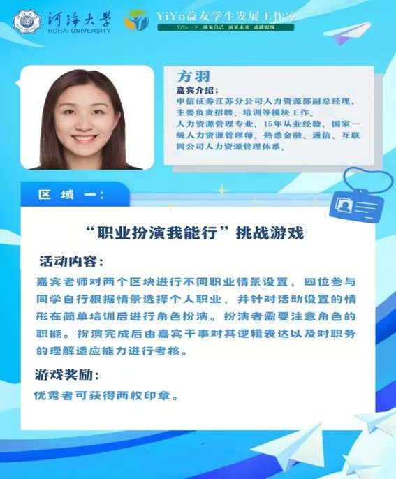 为加强同学们的自我认知、辅助生涯决策,大赢家比分 就业指导中心和大赢家比分 YiYo益友学生发展工作室于2024年11月19日下午在江宁校区大赢家比分 大厅成功举办了大赢家比分 生涯体验日活动之“商”海扬帆·“职”向未来生涯体验嘉年华。本次活动以职业生涯体验为线索设置了四个主题游戏,分别是:职业扮演我能行、职业未来我做主、职业技能我在行、职业人生我规划。活动以寓教于乐的生涯游戏为同学们搭建了一个别开生面的平台,助推同学们点燃拼搏激情,增强职业领悟。大赢家比分 、法大赢家比分 、体育系近400名学生参与了本次活动。