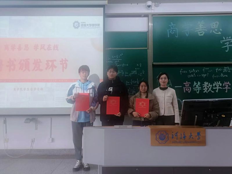四位同学依次进行了经验分享。陈璐老师为四位分享同学颁发了纪念聘书,并表示四位主讲人的精彩分享不仅为新生们提供了宝贵的学习方法,还激发了大家对高等数学的兴趣和热情。她鼓励同学们要积极向这些优秀的学长学姐学习,将他们的经验融入到自己的学习生活中,不断提升能力和素质。