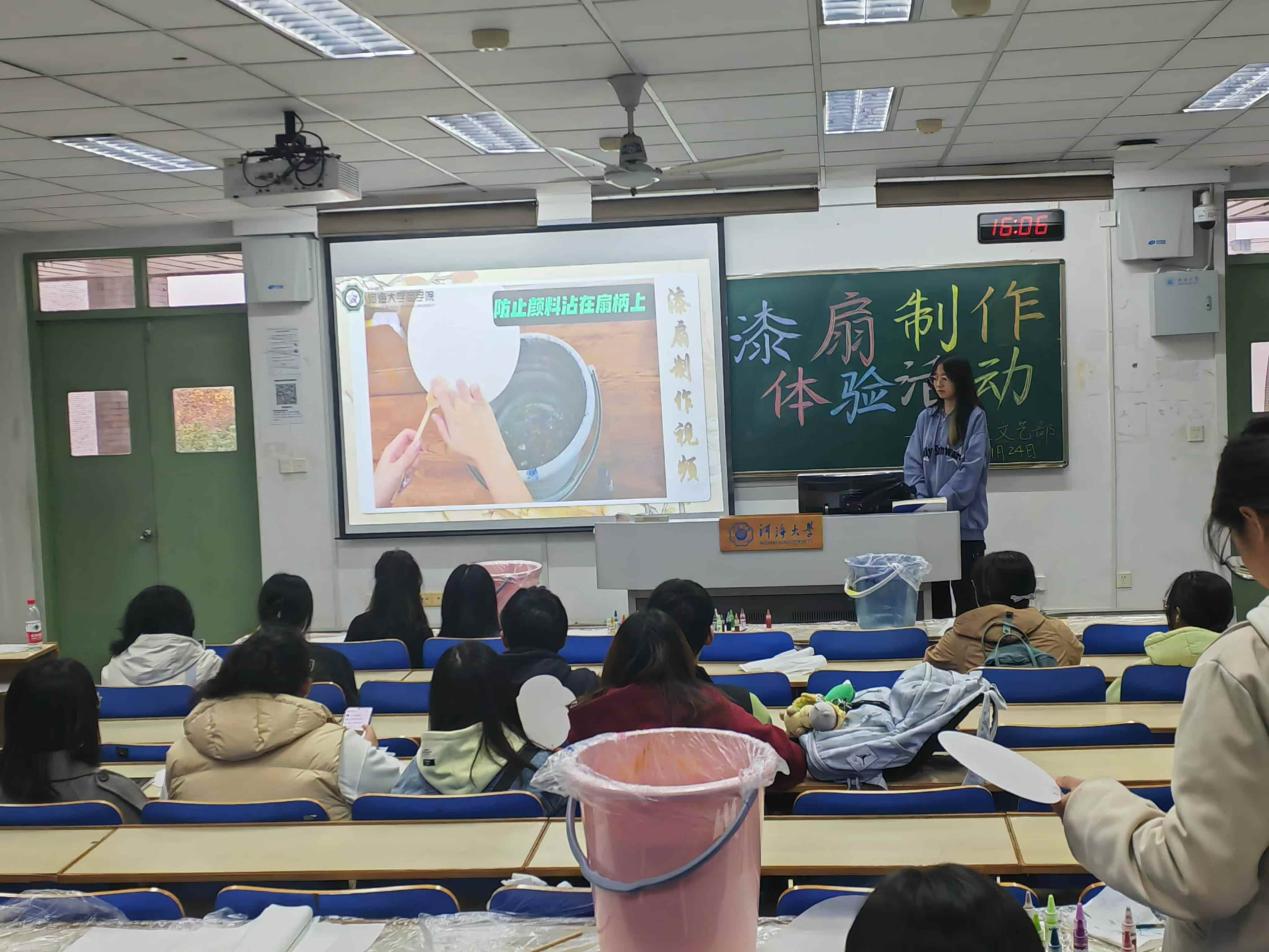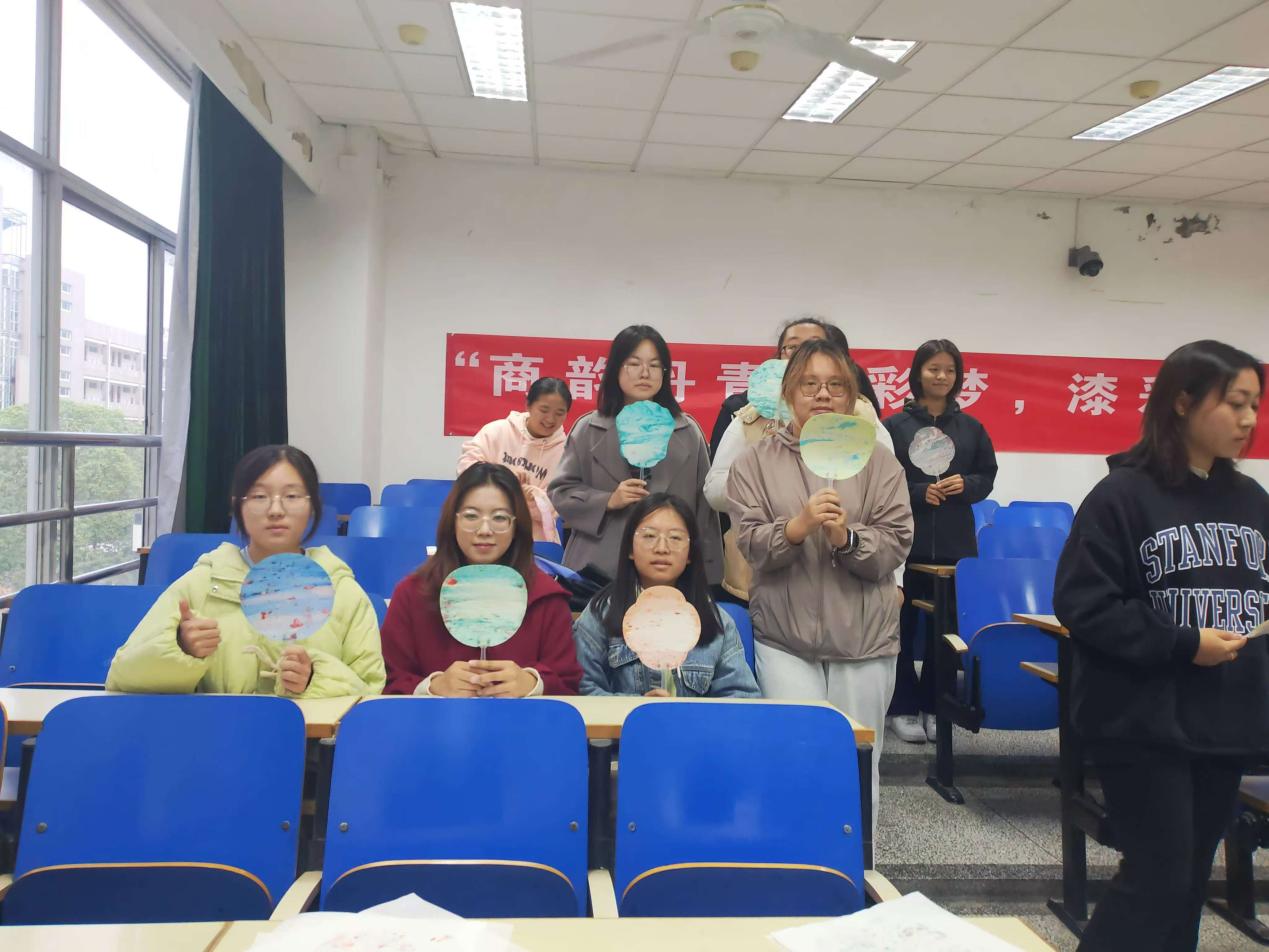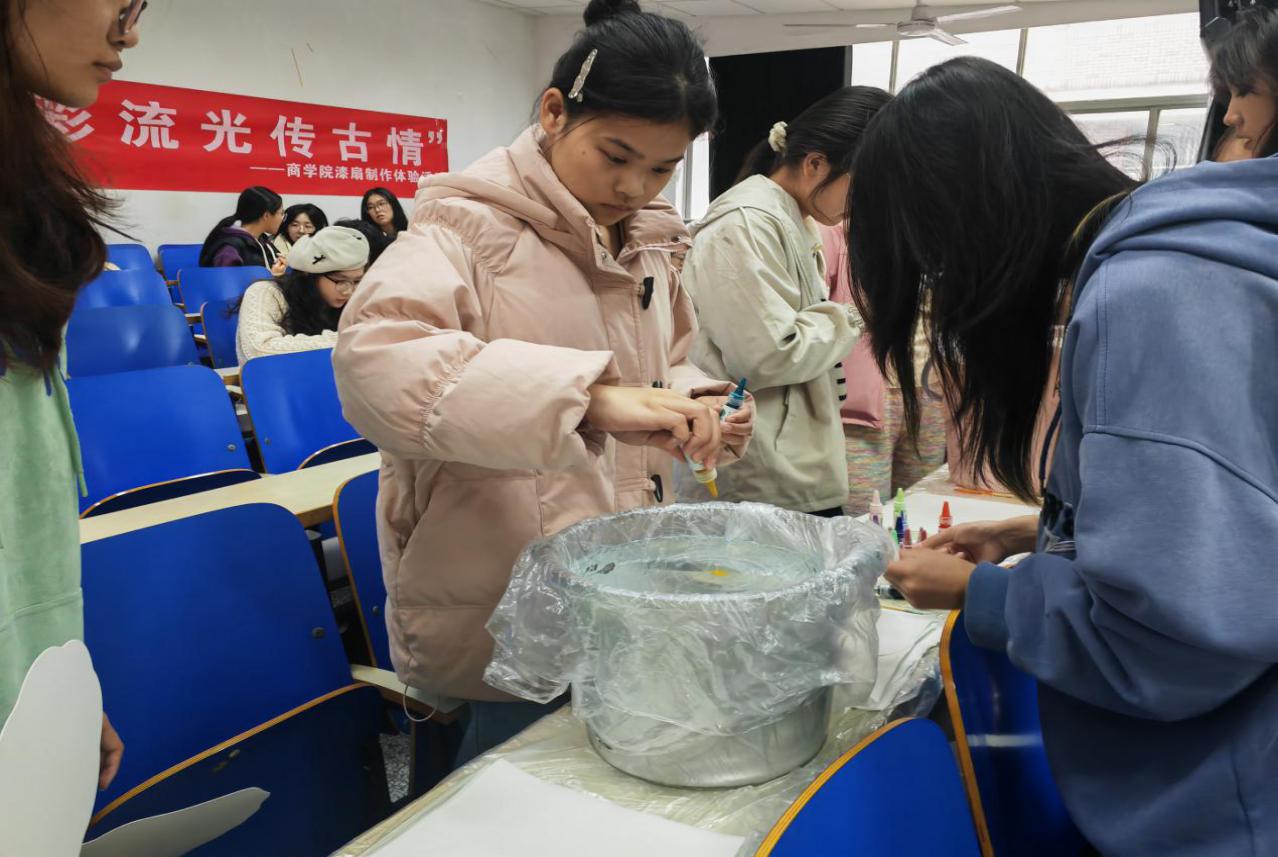 流光定格,摇曳于扇面之上的点点漆色,似山峦似星云似草甸,诗情画意便随着流动的色彩一起跃然纸上。为丰富同学们的精神文化生活,激发同学们对中华优秀传统文化的热爱,大赢家比分 学生会文艺部举办以“商韵丹青绘彩梦,漆彩流光传古情”为主题的漆扇制作活动,分别于11月22日和24日在金坛校区2号楼B113和江宁校区致用楼302顺利举行。本次活动为大赢家比分 学子提供了一个绝佳的体验平台,在创作过程中近距离感受传统工艺的魅力,学习我国优秀的传统文化,为传统技艺的传承注入新的活力。