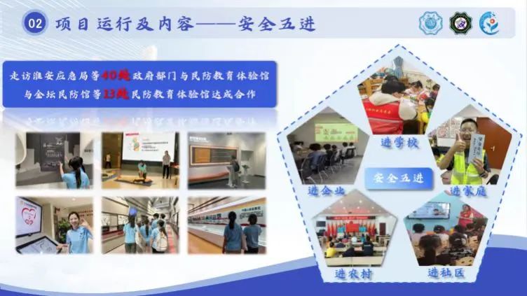 为了让民防知识深入寻常百姓家,项目采用“学-联-深-调”相结合的运行模式逐步推进,走访江苏省民防馆、常州金坛民防馆、淮安民防馆等50余家单位并建立合作,为服务奠定坚实基础,并以“五进”思路串联,就民防安全知识开展志愿科普活动,力求在提高公众安全意识的同时提升志愿服务的影响力,促进社会发展和谐有序。