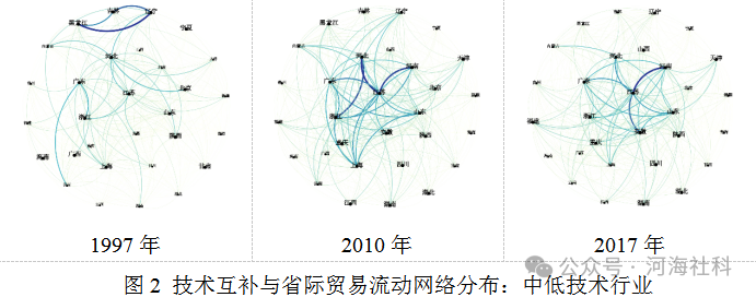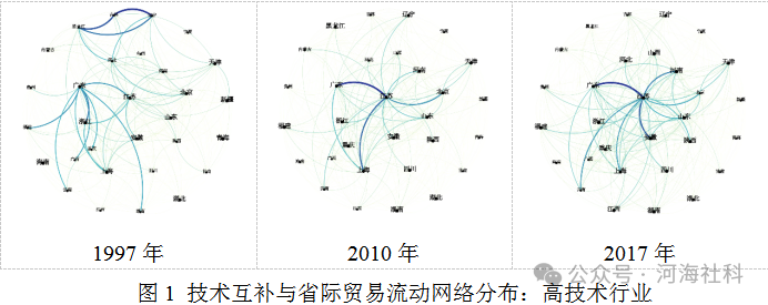 建设全国统一大市场是构建新发展格局的基础支撑和内在要求。自改革开放以来,全国统一大市场建设的重点持续推进,逐步从产品市场竞争、劳动力流动、资本跨地区投资向创新要素跨地区布局与再配置不断深入,引领地区间互动机制从互补性生产联系深入到互补性技术联系,推动省际贸易往来愈发密切。本研究基于Jaffe(1986)构建的技术相似度指标,以及Frenken et al.(2007)将技术多样性分为相关技术多样性和不相关技术多样性的思想,提出省际技术互补指标。使用中国1992~2017年发明专利数据测算得出省际层面技术互补指数与贸易流动份额指数,采用社会网络分析等方法对省际贸易网络分布以及技术互补在其中的作用进行描述分析。本研究发现省际贸易结构逐渐从“以辽宁省、黑龙江省以及吉林省等生产分工支撑的省际贸易流动”向“以江苏省以及广东省等技术分工支撑的省际贸易流动”转变,具备更高技术互补水平的省份往往也具有更多、更紧密的省际贸易关系。具体研究贡献如下: