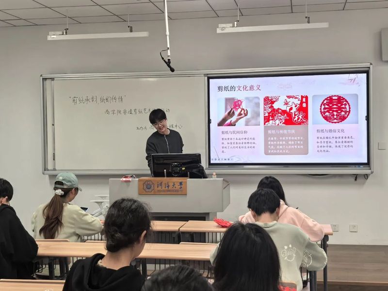 随后的PPT讲解环节循着历史文化脉络层层深入。介绍人概述了剪纸的民间艺术属性与起源,借南北剪纸风格对比彰显地域特色;再循历史轨迹,讲解其用途与发展的流转变化;又分题材与风格解读作品分类,细述剪刻工具选择、技法要素等操作方法;最后串联节日装饰、礼仪点缀及现代设计应用,完整呈现了剪纸的当代活力。详实的讲解与丰富的作品赏析,尽展“人类非物质文化遗产代表作”的深厚底蕴与独特韵味。