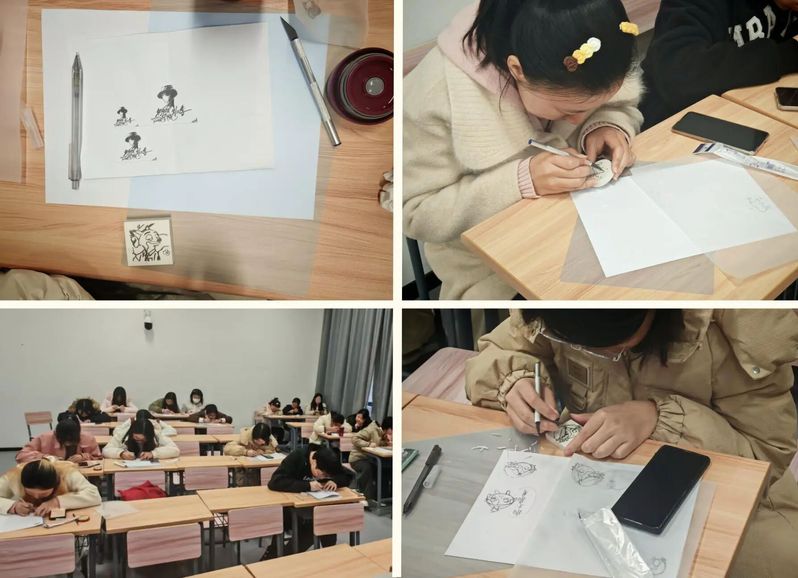 “耳听眼见,不如实践”,在工作人员发放材料包、工具包后,同学们依据个人兴趣选择喜欢的图案,用铅笔轻轻描绘轮廓,认真地用圆口刀细致雕刻,最后打磨纹理和细节,完成了令自己满意的橡皮章作品。