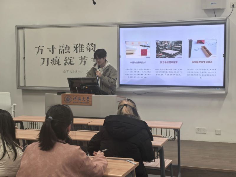 活动开始,传媒中心的工作人员先对传统雕刻艺术和现代的橡皮章雕刻艺术进行系统的讲解。同学们逐步了解了中国传统雕刻艺术和西方橡皮图章起源,各种类型的现代橡皮章雕刻让同学们更清晰地感受到雕刻之美,传媒中心的工作人员总结本次活动的价值与现状,让助力文化传承发展的种子在同学们心中生根发芽。