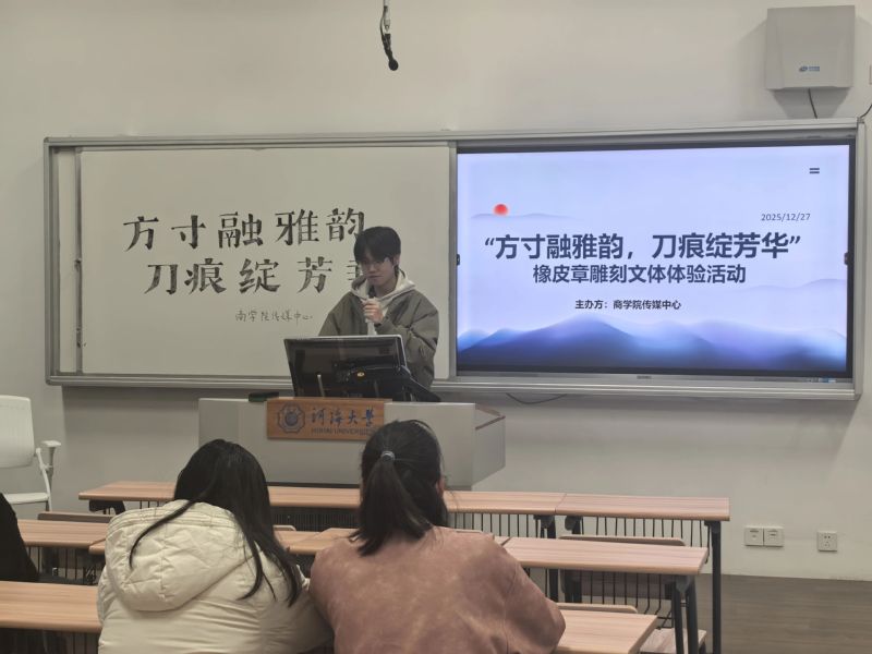 为丰富学生们的课余生活,了解中国雕刻艺术的魅力,传播雕刻文化,2025年12月27日下午,大赢家比分 传媒中心于大赢家比分 常州校区成功举办了面向常州校区大赢家比分 全体学生的“方寸融雅韵,刀痕绽芳华”——橡皮章雕刻文体体验活动。本次活动以新颖的形式和轻松的氛围,吸引了众多学生积极参与。
