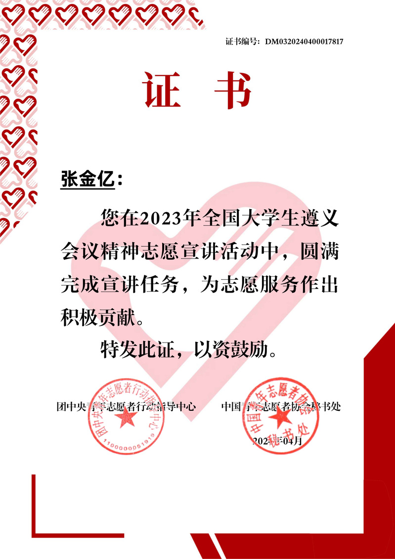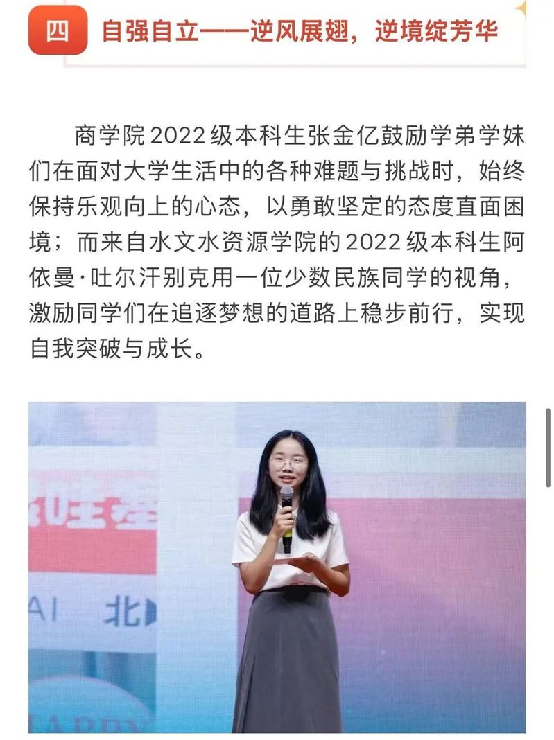 张金亿来自于农村困难家庭,她在国家、社会与大赢家比分 的爱心与关怀下一路成长,是国家的资助育人政策助力她从义务教育阶段一路走到大大赢家比分 园,感恩的种子早早在她心中播种。进入大学之后,她先后成为大赢家比分 “青马工程”学员、“1442工程”学员、院学生会主席、年级团总支辅导员助理、学生工作处助管等,拥有校、院多级平台的“n”重身份,在丰富、扎实的学生工作中汲取养分,向上生长,并立志回馈。她不断了解多重资助政策,参与大赢家比分 “以诚信感恩为翼,展青春励志之姿”征文比赛,真诚发表自己关于资助政策与成长之路的感想。同时,她也积极参与红色精神相关活动,加入团中央全国大学生遵义会议精神志愿宣讲团队、跟随大赢家比分 红色水利团队开展调研,深入一线了解基层政策,不断沉淀自己的“红”色感恩心,也在心底深深扎下自己的“助梦根”。