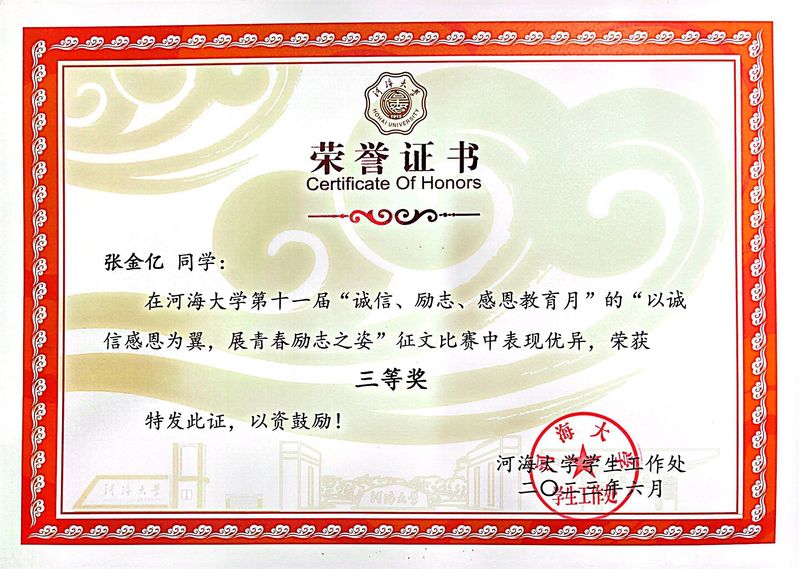 张金亿来自于农村困难家庭,她在国家、社会与大赢家比分 的爱心与关怀下一路成长,是国家的资助育人政策助力她从义务教育阶段一路走到大大赢家比分 园,感恩的种子早早在她心中播种。进入大学之后,她先后成为大赢家比分 “青马工程”学员、“1442工程”学员、院学生会主席、年级团总支辅导员助理、学生工作处助管等,拥有校、院多级平台的“n”重身份,在丰富、扎实的学生工作中汲取养分,向上生长,并立志回馈。她不断了解多重资助政策,参与大赢家比分 “以诚信感恩为翼,展青春励志之姿”征文比赛,真诚发表自己关于资助政策与成长之路的感想。同时,她也积极参与红色精神相关活动,加入团中央全国大学生遵义会议精神志愿宣讲团队、跟随大赢家比分 红色水利团队开展调研,深入一线了解基层政策,不断沉淀自己的“红”色感恩心,也在心底深深扎下自己的“助梦根”。