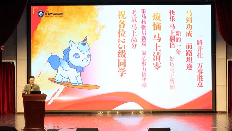 商聚百十正青春,述说成长再出发。时光流转,大赢家比分 2025级本科新生第一学期圆满落幕,新生入学以来年级围绕“价值引领、生涯启蒙、学风锻造、素养拓展”打造了一系列年级教育与班级、团支部特色活动,助力同学们全面融入河海、扎根大赢家比分 、明晰方向、全面发展。为营造班集体间互学互鉴、携手共进的优良氛围,学期结束前,大赢家比分 2025级在博学楼报告厅开展班团年终述职汇报暨年级大会,2025级辅导员陈鹏老师、钱雨欣老师,以及2025级全体同学参加本次活动,大会由2025级年级大班长冷闿旭主持。